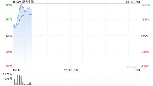 康方生物(09926)早盘涨超5%,截至发稿,股价上涨5.25%,报118.30港元,成交额3.77亿港元。