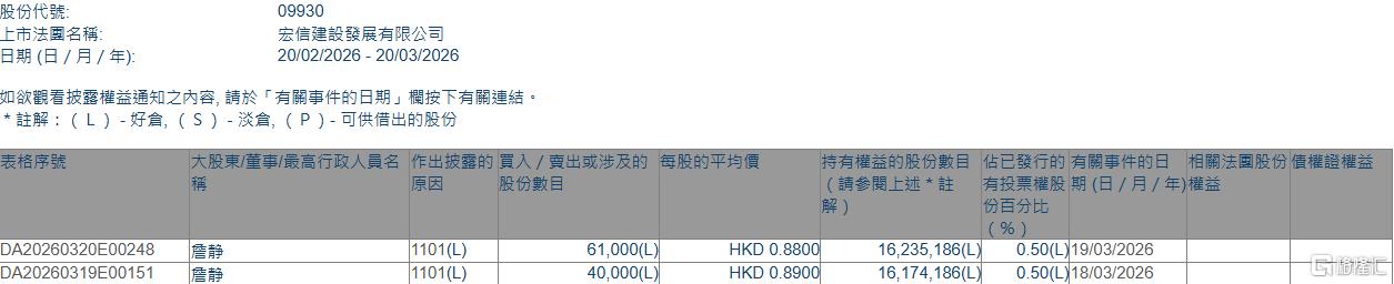格隆汇3月20日丨根据联交所最新权益披露资料显示,2026年3月18日-3月19日,宏信建发(09930.HK)获执行董事詹静在场内以每股均价0.88-0.89港元合计增持10.1万股,涉资约9万港元。