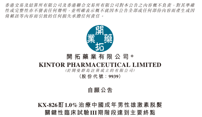 3月18日,开拓药业宣布,其自主研发、潜在同类首创的KX-826酊1.0%治疗中国成年男性雄激素脱发(AGA)的关键性临床试验III期阶段已获得顶线数据。数据显示,该III期阶段达到主要研究终点,结果具有统计学显著性及临床意义,且有效性和安全性均表现出色。
