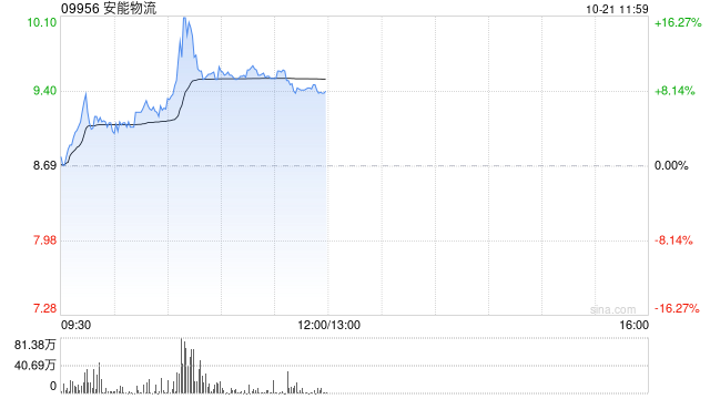 安能物流(09956)盘中涨超16%,截至发稿,股价上涨8.86%,现报9.46港元,成交额1.60亿港元。