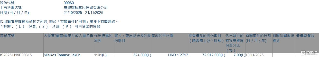 格隆汇11月21日丨根据联交所最新权益披露资料显示,2025年11月19日,康圣环球(09960.HK)获Mialkos Tomasz Jakub在场内以每股均价1.2717港元增持52.4万股,涉资约66.64万港元。