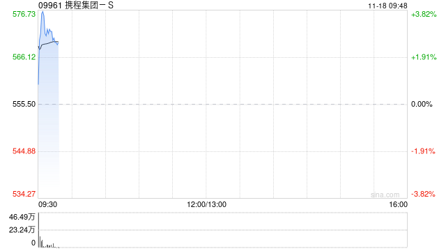携程集团-S(09961)绩后涨近4%,截至发稿,股价上涨2.52%,现报569.50港元,成交额7.05亿港元。