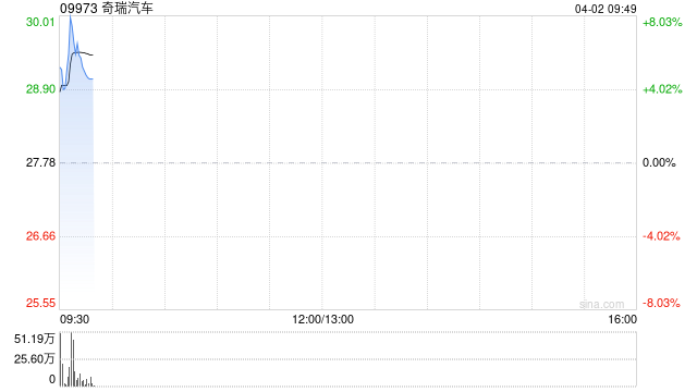 奇瑞汽车(09973)盘初涨超7%,截至发稿,股价上涨4.61%,现报29.06港元,成交额7884.27万港元。