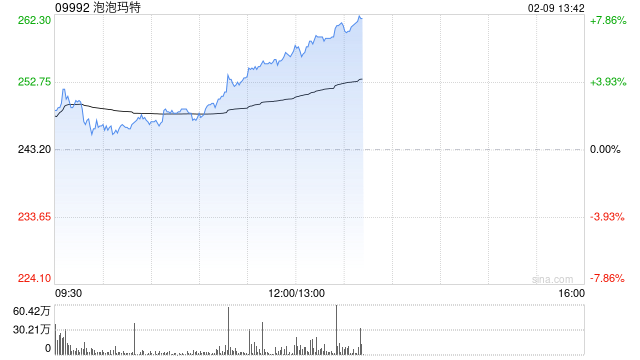 港股新消费概念股午后走高,泡泡玛特涨超7%,老铺黄金涨超5%,布鲁可 涨超4%,鸣鸣很忙、名创优品涨超2%。