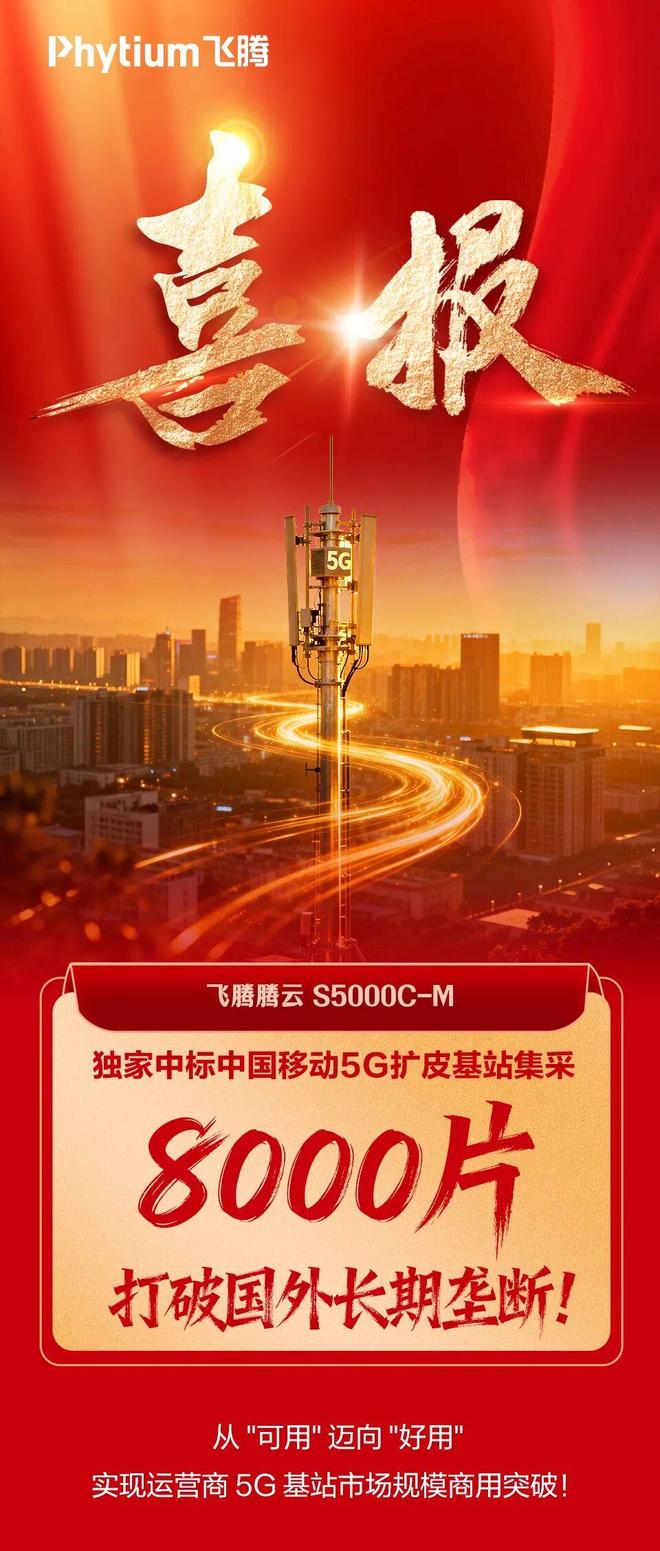 飞腾腾云 S5000C-M 独家中标中国移动 5G 扩皮基站集采 8000 片,打破国外长期垄断。