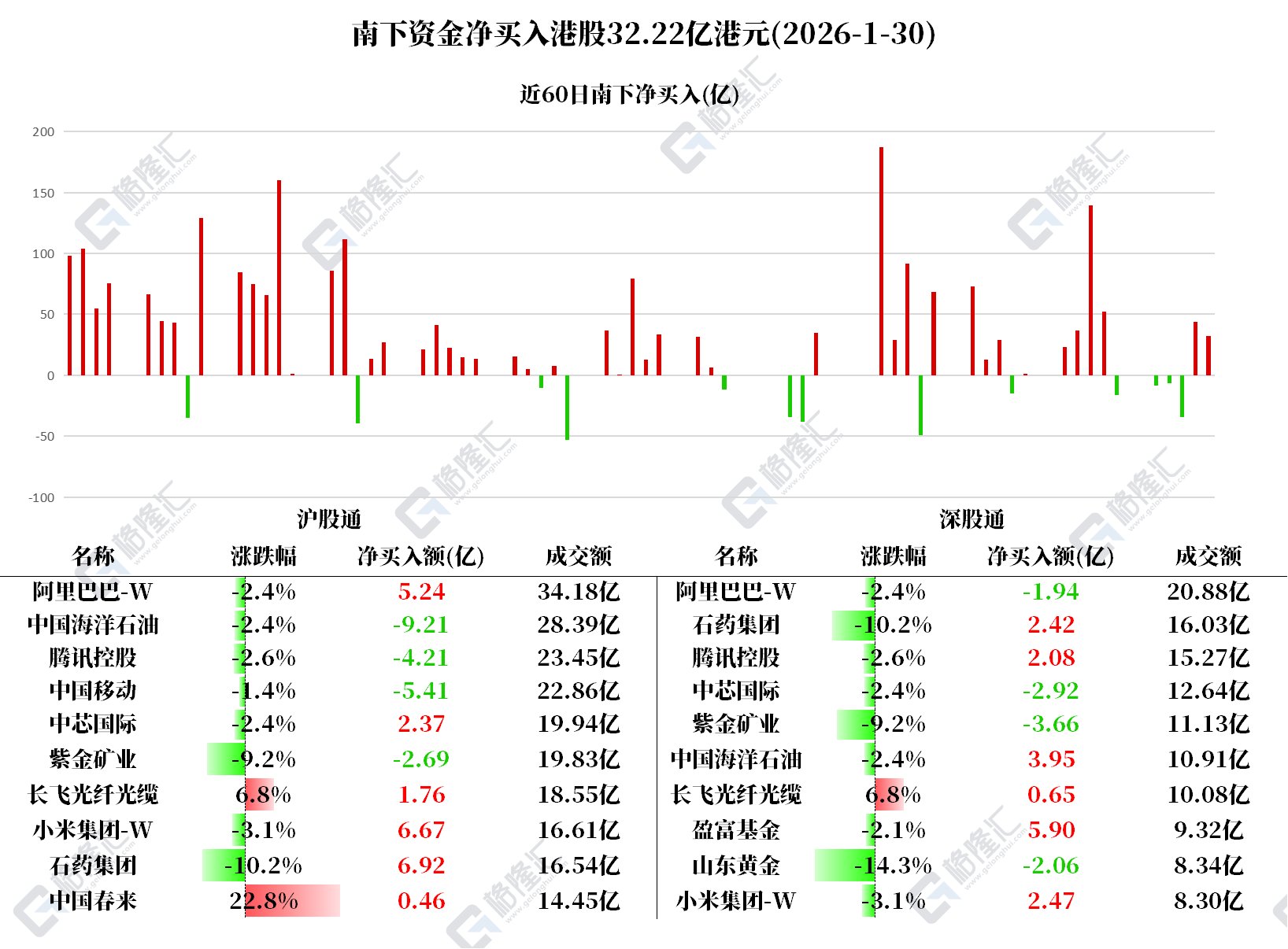 格隆汇1月30日|南下资金今日净买入港股32.22亿港元。其中: