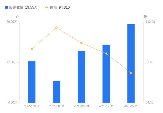 近一年(2025年2月28日至2026年2月28日),中国移动A股股东户数从10.99万户,增加至19.55万户,增幅77.91%,区间股价下跌7.73%。