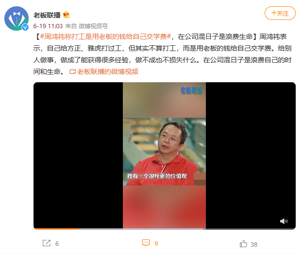 近日,周鸿祎在社交平台发布视频称,打工就是用老板的钱,给自己交学费,做不成损失的是公司,做成了,自己收获了很多经验。周鸿祎表示,自己给方正、雅虎打过工,但其实不算打工,而是用老板的钱给自己交学费。