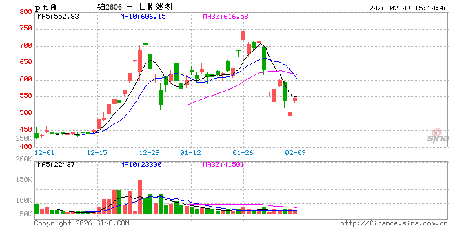 2026年2月9日,国内期货主力合约涨跌不一。铂涨近11%,沪银涨超8%,钯涨超7%,沪锡涨超6%,碳酸锂、沪金涨超3%,烧碱涨超2%,国际铜、沪铜涨近2%;跌幅方面,苯乙烯(EB)跌超2%,原木、硅铁、低硫燃料油(LU)、锰硅、焦炭、沥青、苹果跌超1%。