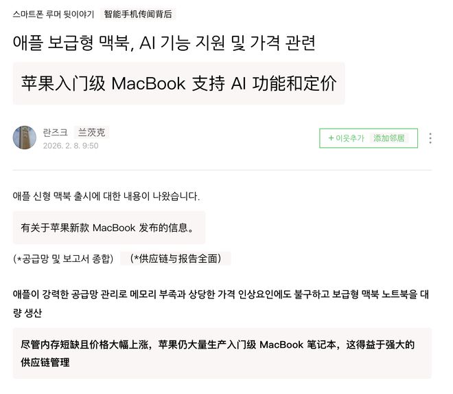 IT之家 2 月 9 日消息,消息人士 yeux1122 昨天在 Naver 博客发文,透露苹果平价款 MacBook 的详细规格、出货数量。