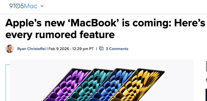 【环球网科技综合报道】2月10日消息,据9to5mac综合多方消息报道,苹果公司计划推出一款全新入门级Mac笔记本电脑,暂定名为“MacBook”(无Air/Pro后缀),主打亲民价格与轻量化设计。该产品预计将于今年上半年发布,有望成为苹果Mac系列中售价最低的机型。