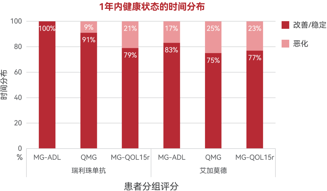 基于MG-ADL评分,接受瑞利珠单抗治疗的患者在一年内100%的时间处于改善或稳定状态,接受艾加莫德治疗的患者在一年内有83%的时间处于改善或稳定状态;以QMG和MG-QOL15r衡量时,接受瑞利珠单抗治疗的患者分别有91%和79%的时间处于改善或稳定状态,接受艾加莫德治疗的患者分别有75%和77%的时间处于改善或稳定状态(图1)。