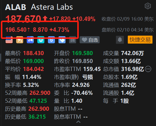 Astera Labs((ALAB.US)盘前继续上涨近5%,该股此前2日累计大涨超30%。消息上,Astera Labs将于美东时间2月10日盘后公布Q4财报,市场重点关注Astera Labs在亚马逊上调资本开支背景下,其Aries PCIe Retimer及Scorpio Switch产品线放量进展。GAAP净利润市场一致预期是5124万美元,同比增长107%,环比下滑44%,公司指引上限是3660万美元。