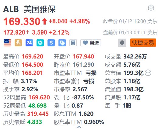 昨日收涨4.98%的美国雅保(ALB.US)今日美股盘前续涨2.12%,报172.92美元。昨日收涨7.31%的Lithium Argentina AG(LAR.US)今日美股盘前续涨3.2%,报7.73美元。