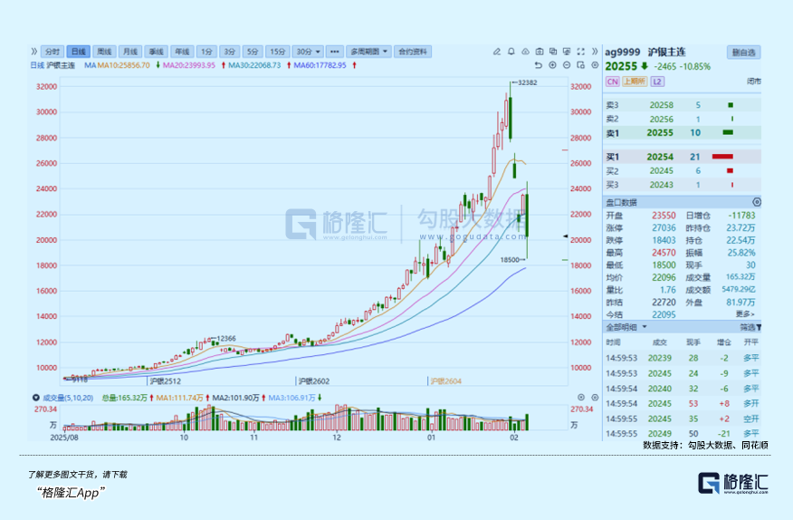 就在今天盘中,国际白银价格再度一度暴跌超12%,国内白银期货主力合约更是盘中大跌近20%,当天收跌10.85%,价格最低跌至18500元/千克,显著掉出周二“史诗级暴跌”时的最低价。