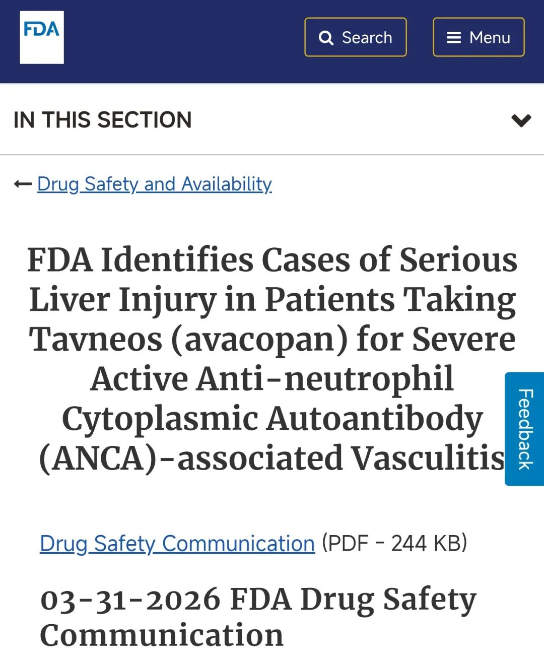 2026年4月1日,美国食品药品监督管理局(FDA)于3月31日发布安全警报,确认安进公司(Amgen)旗下的罕见病药物Tavneos(通用名:avacopan,阿伐可潘)与至少8例死亡事件存在关联,这些死亡病例均涉及严重的药物性肝损伤(DILI)。