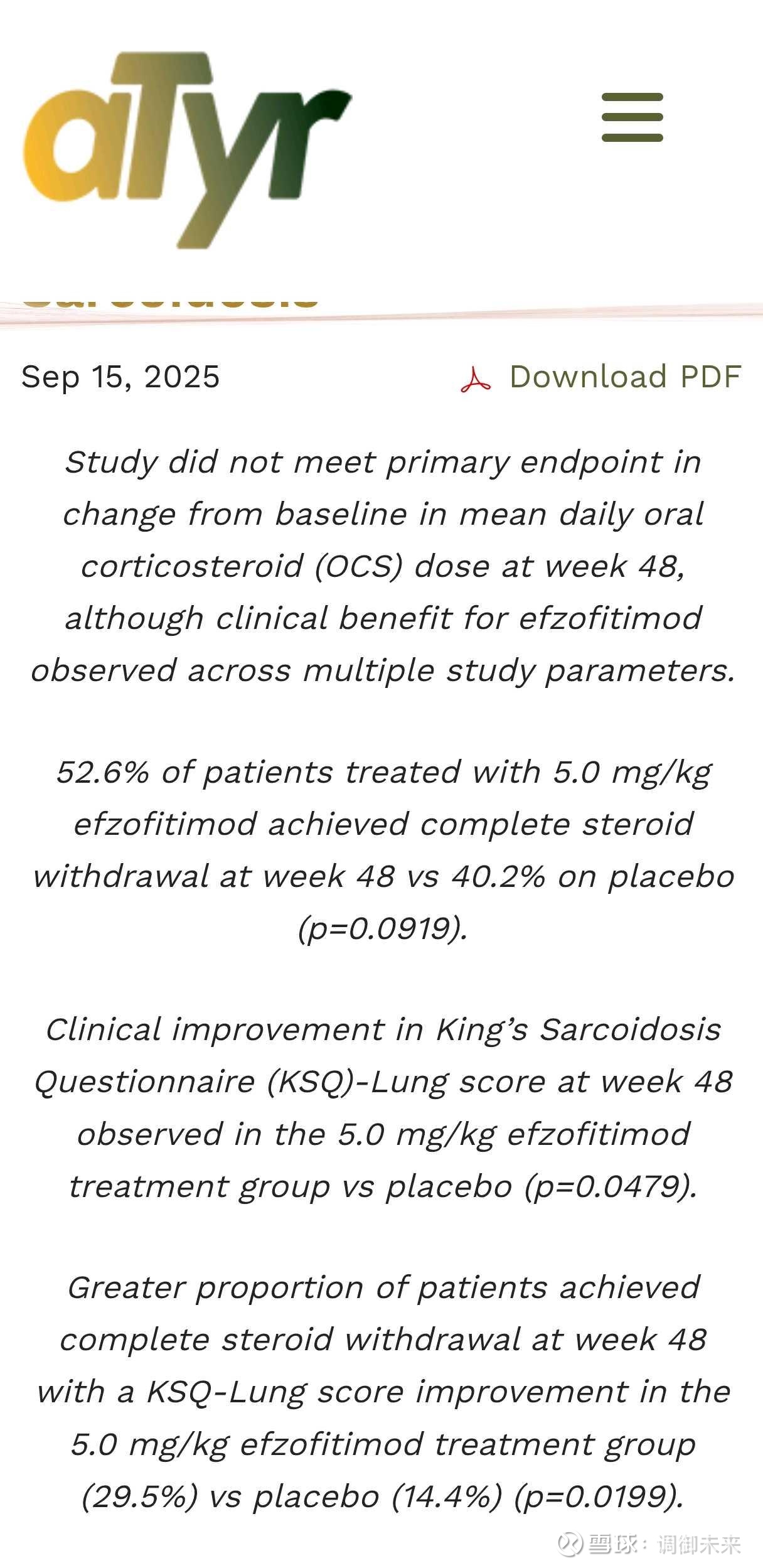 2025 年 9 月,aTyr Pharma(纳斯达克代码 LIFE)迎来了最关键的时刻。其核心项目 efzofitimod 在肺结节病 (sarcoidosis) 的 III 期试验 EFZO-FIT 公布顶线结果——主要终点失败。消息一出,股价当日暴跌超过 80%,公司市值几乎跌至现金储备水平。