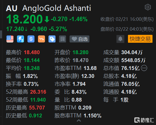 格隆汇2月22日丨AngloGold(AU.US)盘前跌5.27%报17.24美元。AngloGold因尾矿厂正在进行的工作而暂停了其在巴西一家工厂的黄金加工,从而降低了今年的产量前景。此外,AngloGold还称正在探索出售Cuiabá金矿生产的黄金精矿的方案。
