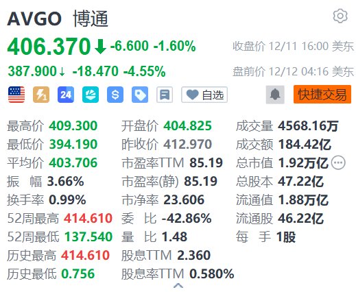 格隆汇12月12日|博通(AVGO.US)盘前跌4.55%,报387.9美元。消息面上,博通首席执行官Hock Tan在与分析师电话会议上发表的讲话引发担忧。他表示,公司目前积压了价值730亿美元的人工智能产品订单,这些订单将在未来六个季度内交付,这一数字令一些投资者感到失望。但Tan试图澄清,这只是一个“最低值”。“我们预计未来六个季度内,随着更多订单的到来,交货量还会大幅增加。因此,根据具体产品的不同,我们的交货周期可能从六个月到一年不等。”(格隆汇)