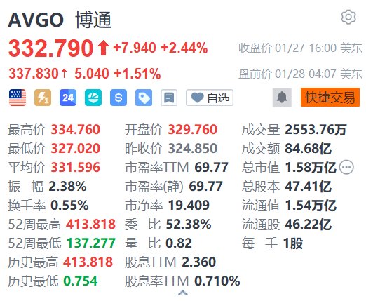 格隆汇1月28日|昨日收涨2.44%的博通(AVGO.US)今日美股盘前续涨1.51%,报337.83美元。消息面上,根据Counterpoint Research的分析,博通预计将在2027年继续保持其在人工智能服务器运算ASIC设计合作伙伴领域的领先地位,市场份额将达到60%。(格隆汇)