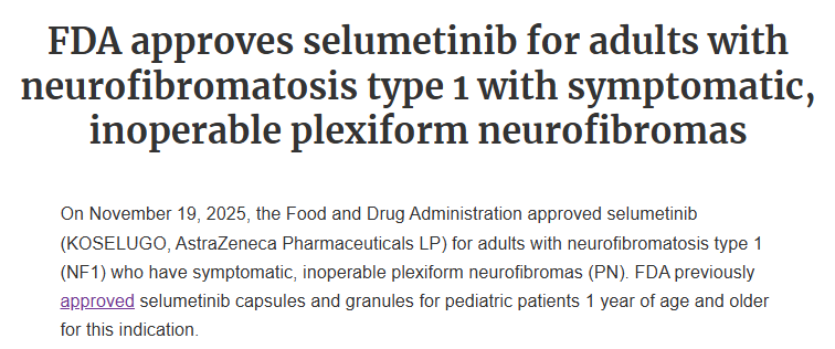11月19日,FDA官网显示,阿斯利康的氢司美替尼(Selumetinib)胶囊获批新适应症,用于有症状且无法手术的1型神经纤维瘤病(NF1)相关丛状神经纤维瘤(PN)成人患者。