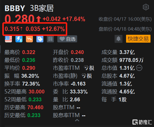 格隆汇4月18日丨昨日反弹17.6%的3B家居(BBBY.US)盘前继续涨12.67%,报0.315美元。据悉,公司寻求在4月26日之前筹集3亿美元,以避免破产。截至2023年4月10日,3B家居(BBBY.US)通过出售1.01亿股股票筹集了约4850万美元。