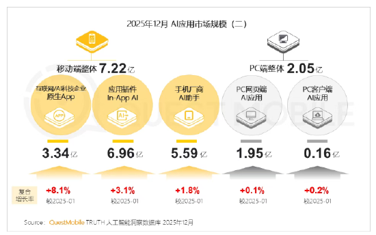 QuestMobile数据显示,截至2025年12月,国内四类AI应用活跃度全面提升。其中,“应用插件(In-App AI)”用户规模高达6.96亿,成为目前用户触达最广的AI形态;而原生App则保持着强劲的复合增长率。