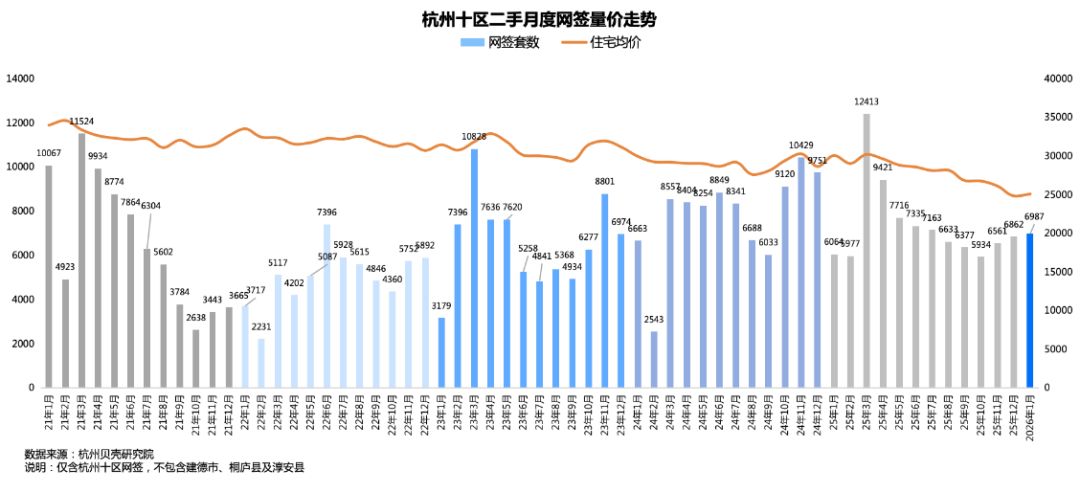 据杭州贝壳研究院数据,2026年1月,杭州市区(含临安、富阳)共成交6987套二手房,环比2025年12月的6862套提升1.8%,同比2025年1月的6064套提升了15%。
