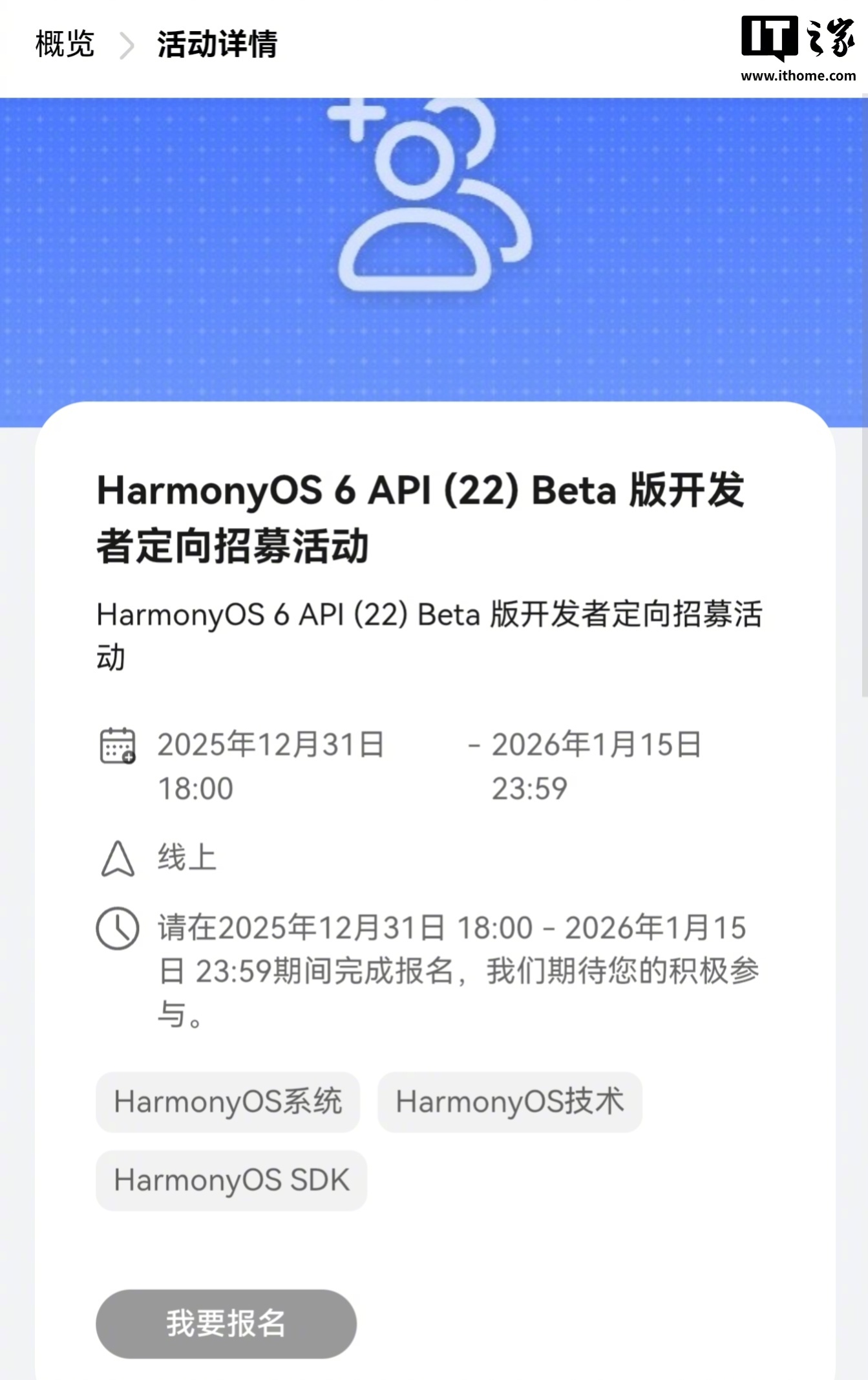 【华为鸿蒙 HarmonyOS 6 API (22) Beta 版开发者定向招募 12 月 31 日报名】2025 年 12 月 27 日,华为上线 HarmonyOS 6 API (22) Beta 版开发者定向招募,报名时间 12 月 31 日至 2026 年 1 月 15 日 18:00。该版本供开发者提前体验新功能。#华为鸿蒙招募#