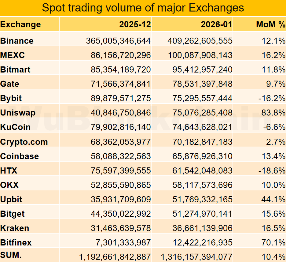 2026 年 1 月主要交易所的现货交易量相较 2025 年 12 月上升约 10%。变化率排名前三名为 Uniswap +84%、Bitfinex +70% 与 Upbit +44%。排名后三名为 HTX -19%、Bybit -16% 与 KuCoin -7%。