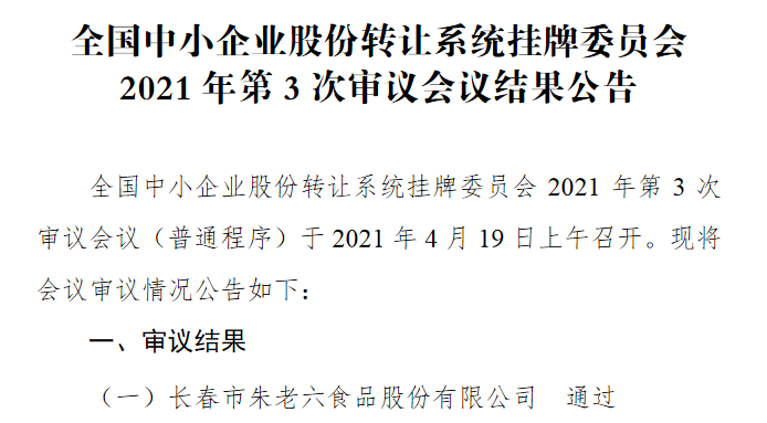 原标题:精选层2021年第3次审议会议结果出炉:朱老六过会