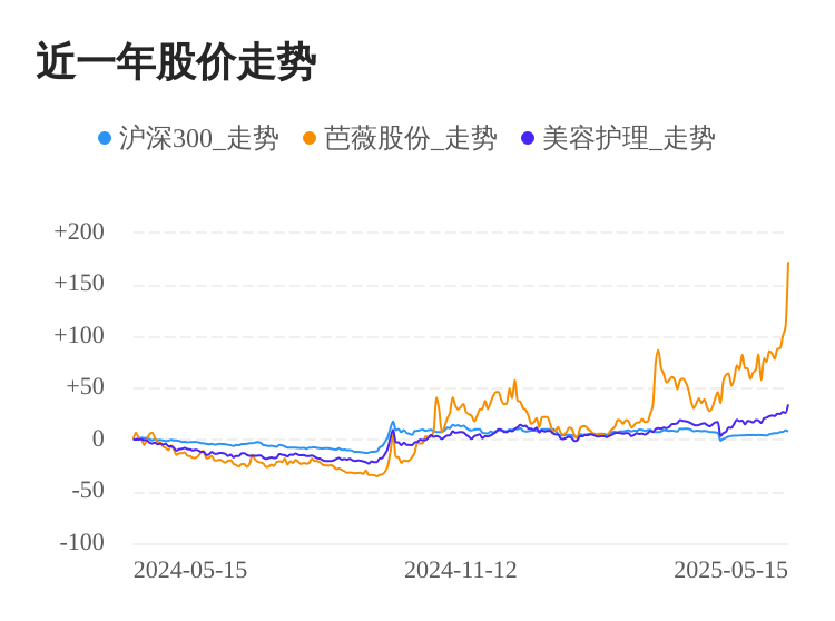 05月15日,芭薇股份股价大涨。截至今日收盘,芭薇股份上涨29.97%,收盘价为35.39元,收盘价创历史新高。