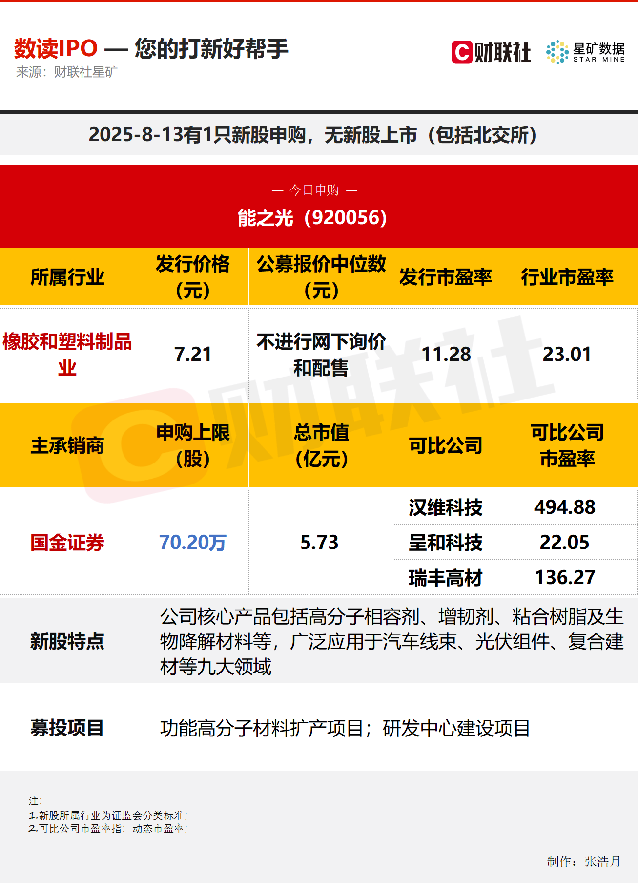 财联社8月13日讯,今日有1只新股申购,为北交所的能之光;无新股上市。