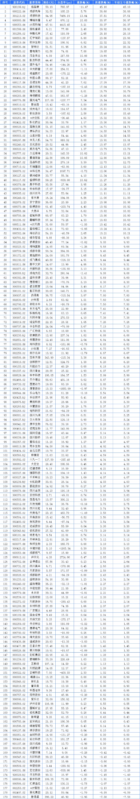 数据显示,179家四川A股,其中收涨164家,收平4家,收跌11家。