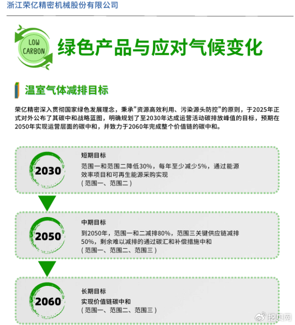 在公司治理层面:荣亿精密严格遵循监管标准,确保独立董事占比董事会不少于三分之一,兼任高管职务的董事人数不超过总数的二分之一。依据荣亿精密2024年ESG报告,公司董事会中,独立董事占比达43%,研发、财会、法律等专业人士合计占比达57%,充分显示了董事会的独立性、多元化与专业性。 在环境保护方面:荣亿精密深入贯彻国家绿色发展理念,秉承资源高效利用、污染源头防控的原则,于2025年正式对外公布了其碳中和战略蓝图,明确规划了至2030年达成运营活动碳排放目标,预期在2050年实现运营层面的碳中和,并致力于2060年完成整个价值链的碳中和。