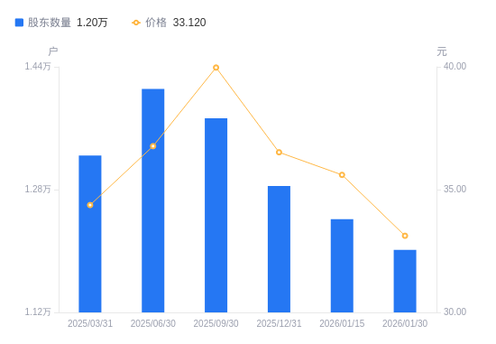 近一年(2025年3月31日至2026年1月30日),鼎智科技A股股东户数从1.32万户,减低至1.2万户,降幅9.28%,区间股价下跌10.90%。