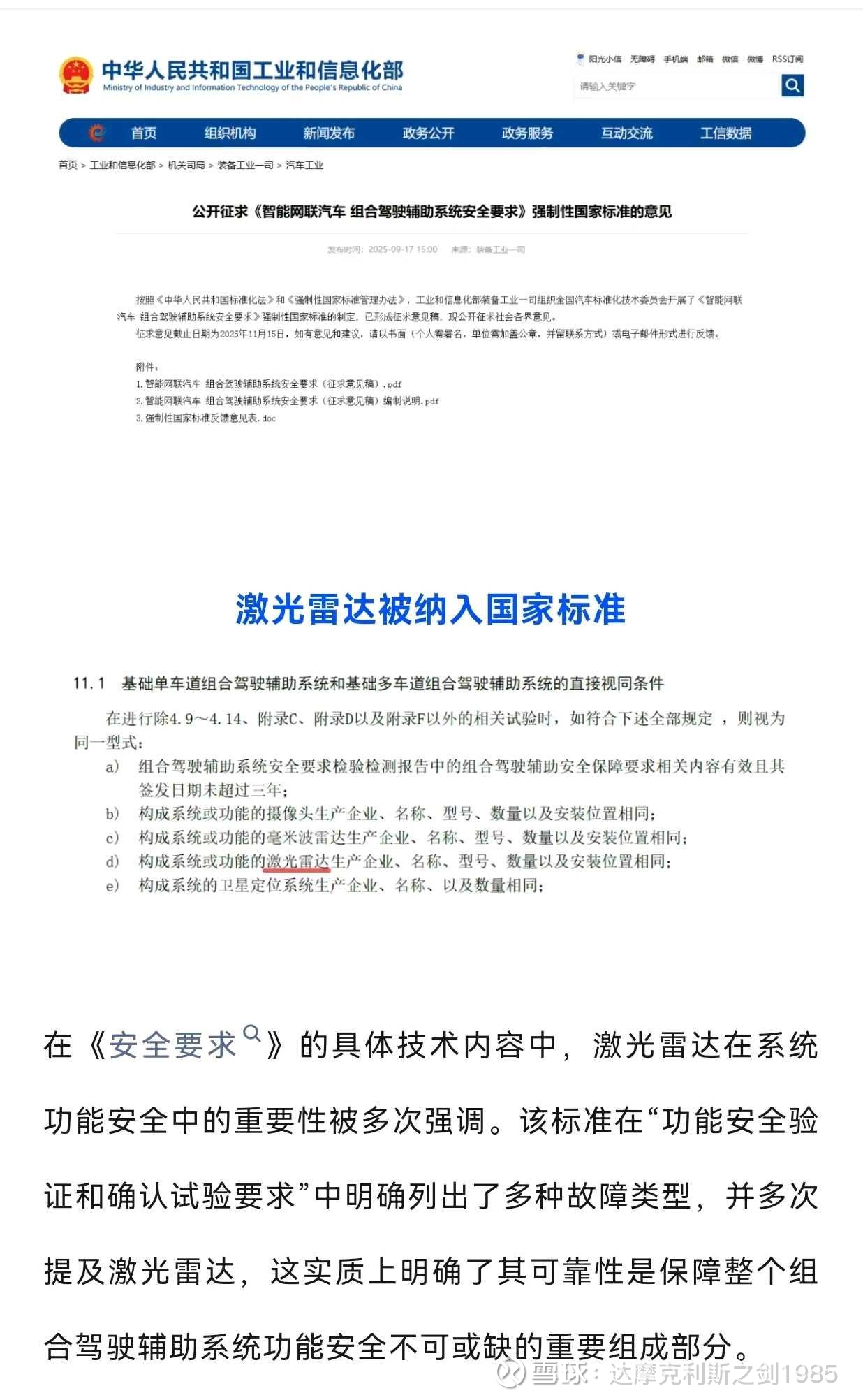 工业和信息化部就《智能网联汽车 组合驾驶辅助系统安全要求》强制性国家标准公开征求意见,首次将激光雷达正式纳入国家标准体系,中国激光雷达产业迎来了前所未有的政策东风。