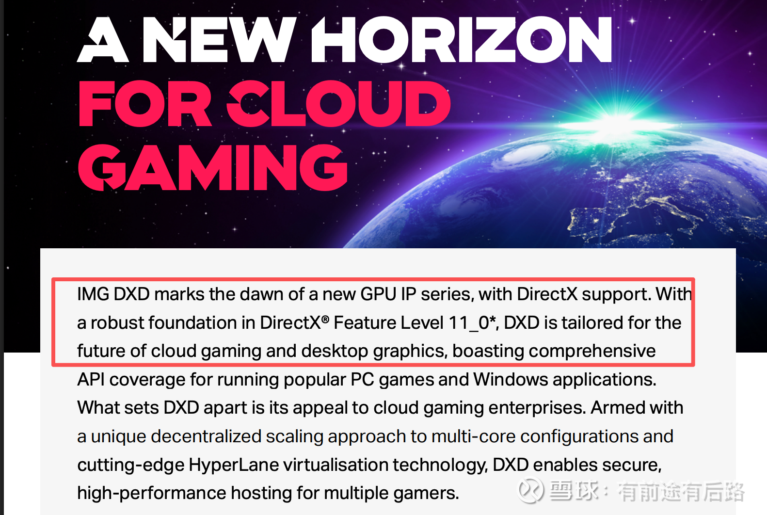 和Imagination DXD的合作GPU,目前也没有正经GPU使用这个IP,第一个吃螃蟹的可以出名也可以出窍,而且明确说明是主要支持云桌面和云游戏,不是主打单机游戏,明确支持DirectX 11,12没说,没说就是不知道?不支持?不好说?