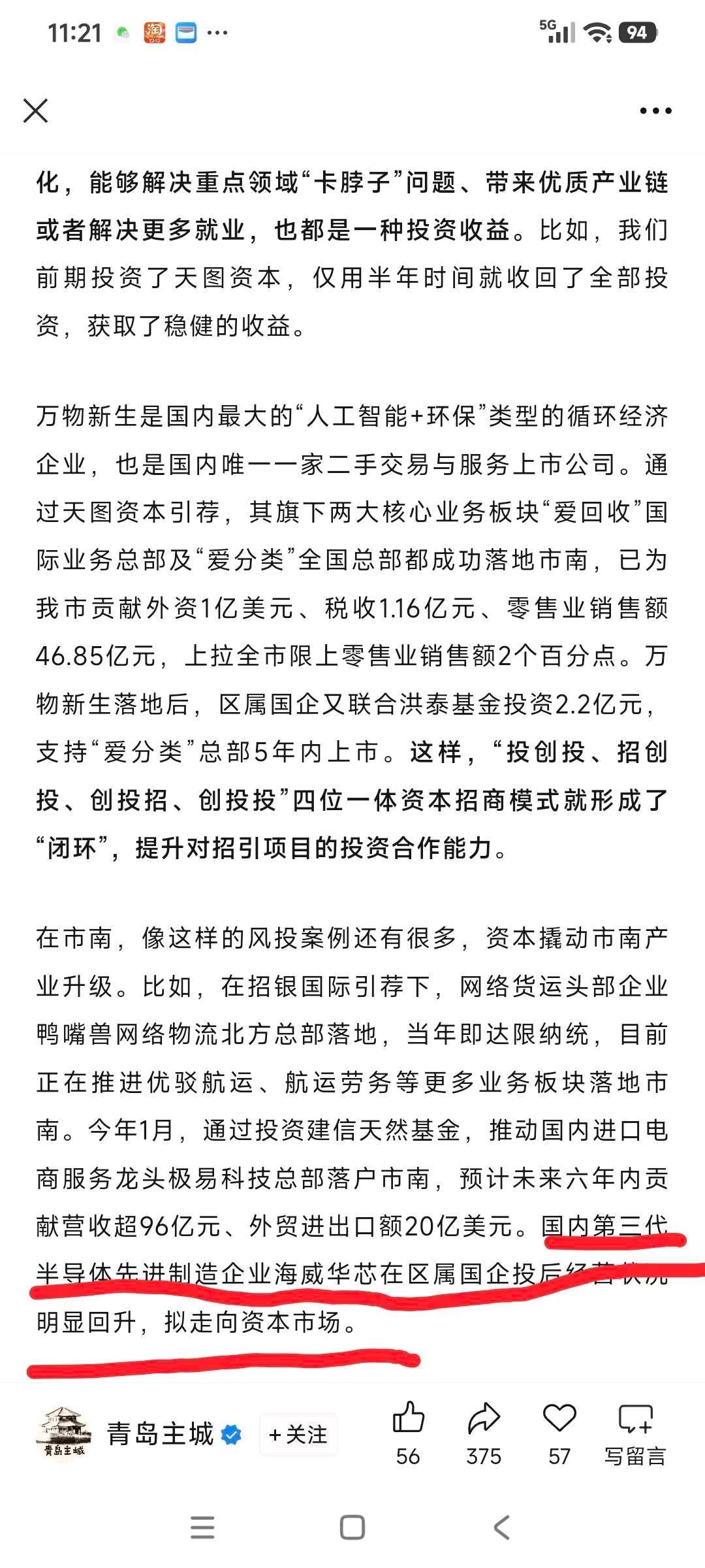 : 今年3月青岛市南区区委书记表示,国内第三代半导体先进制造企业海特高新持股海威华芯在区属国企投后经营状况明显回升,拟走向资本市场。