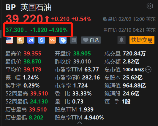 英国能源巨头英国石油(BP.US)美股盘前跌4.9%。消息上,英国石油公布,去年第四季基本重置成本利润为15.4亿美元按年升32%,符合市场预期。全年基本重置成本利润74.85亿美元按年跌16%,低于市场预期的75.8亿美元。