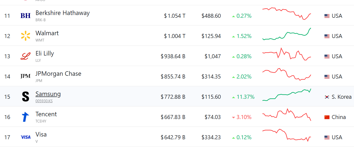根据全球股市市值数据跟踪平台companiesmarketcap,沃尔玛市值已经排到全球第12位,仅次于伯克希尔哈撒韦(巴菲特旗舰公司),超过了三星、腾讯等科技龙头。
