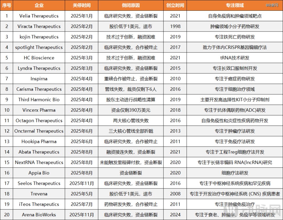 图1.今年已倒闭的20家Biotech(数据来源:Fierce Biotech,动脉网制图)近日,《Fierce Biotech》发布了一份年度特殊报告,记录了今年以来全球生物科技领域的“阵亡名单”——截至11月1日,2025年共有16家生物科技企业正式关停,另有3家濒临破产,挣扎在生死边缘。而就在该报告发布一周后,Arena BioWorks也正式宣布关停,从而将今年倒下的Biotech数量刚好增加至20家。