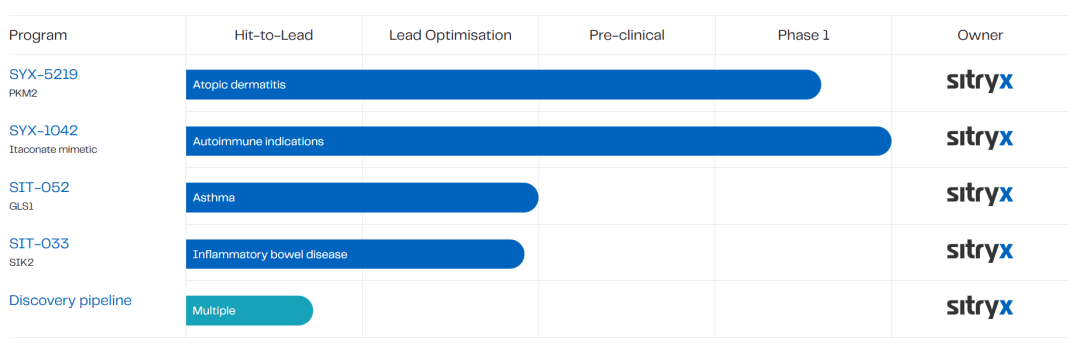 Sitryx在研资产还包括针对特应性皮炎的PKM2调节剂SYX-5219(I期临床)、用于过敏性哮喘的GLS1抑制剂SIT-052、针对溃疡性结肠炎的SIK2抑制剂SIT033。
