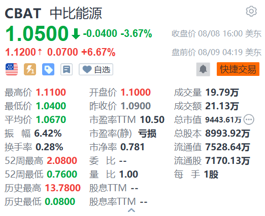格隆汇8月9日|中比能源(CBAT.US)盘前涨6.67%,报1.12美元。中比能源是全球领先的集锂离子电池研发、生产、销售为一体的高新企业,产品主要为圆柱锂离子电池,应用覆盖电动车、储能等领域。公司将于美东时间8月9日盘前公布2024年二季度及上半年业绩。