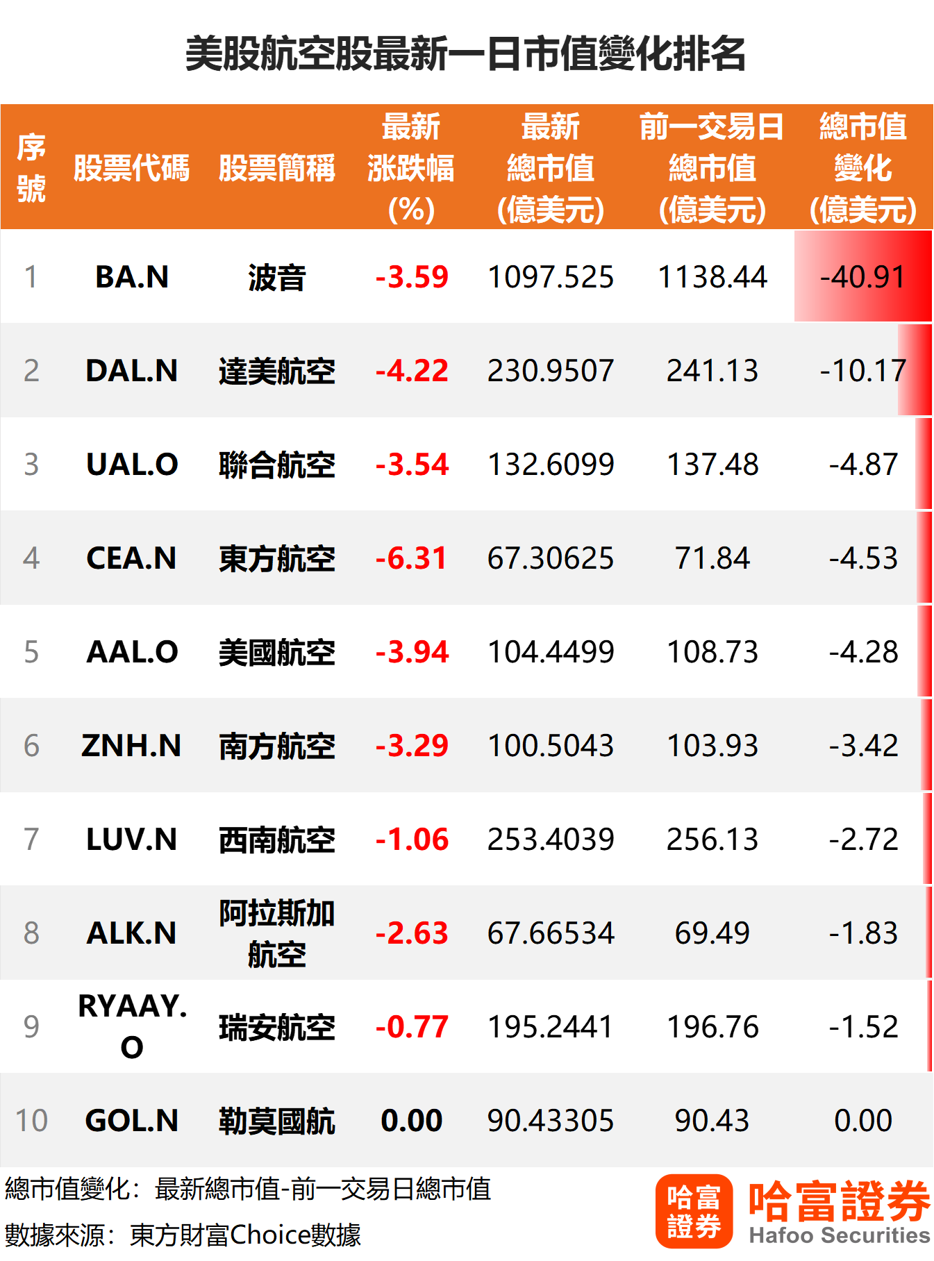 东航一架波音737飞机坠毁,隔夜美股航空板块普跌,截止收盘,波音跌超3%,总市值较上一交易日减少40.91亿美元;东方航空跌超6%,总市值较上一交易日减少4.53亿美元。