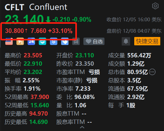 数据流软件制造商Confluent(CFLT.US)盘前大涨33%。消息上,IBM正就收购数据基础设施公司Confluent进行深入谈判,交易金额约为110亿美元。此举旨在增强这个"蓝色巨人"把握云服务日益增长需求的能力。消息人士称,这笔交易最早可能在周一宣布。Confluent是一个开源平台,用于处理从银行交易到网站点击的海量实时数据流。截止目前,Confluent的市值约为80.9亿美元,而总部位于纽约的IBM市值约为2878.4亿美元。