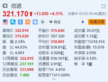 美国医疗保险巨头信诺集团(CI.US)涨4.5%,报321.17美元。信诺第四季度业绩营收为511.5亿美元,同比增长11.82%,高于分析师普遍预期的488.9亿美元;调整后每股收益为6.79美元,同比增长35.26%,高于分析师普遍预期的6.53美元。公司拟派每股1.40美元的现金季度股息,同比增长14%。