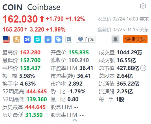 格隆汇2月25日|加密交易平台Coinbase(COIN.US)盘前涨1.99%,报165.25美元。消息面上,Coinbase宣布,已向所有美国客户开放股票与交易型开放式指数基金(ETF)交易,标志着公司业务正式从数字资产扩展至传统证券领域,朝着打造“一站式交易所”的目标迈进。此次上线后,用户可在与加密资产相同的平台上买卖美国上市股票和ETF。(格隆汇)