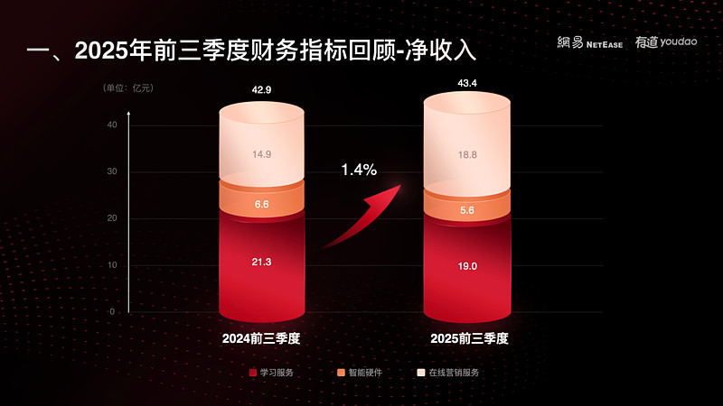 一、主要财务指标回顾今年前三季度,有道累计净收入43.4亿元,同比增长1.4%。
