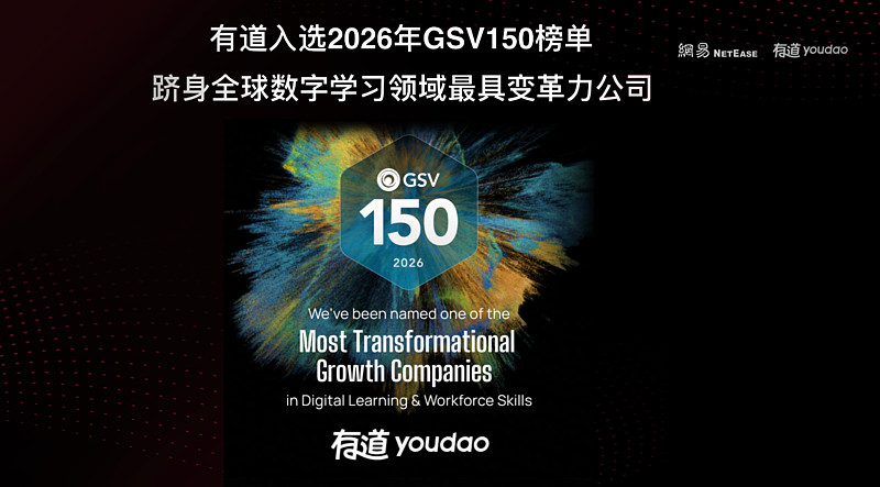 今年,有道从全球3000多家公司中脱颖而出,成功入选了2026年GSV150榜单,被评为全球数字学习与职业技能领域最具变革性的公司之一。